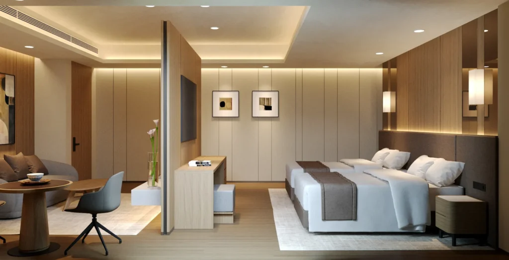 The One Bedroom Suite with Jacuzzi features a refined contemporary design with warm wooden accents and soft ambient lighting. The spacious bedroom can be arranged as king or twin bedding, complemented by a comfortable seating area and a private balcony overlooking greenery.